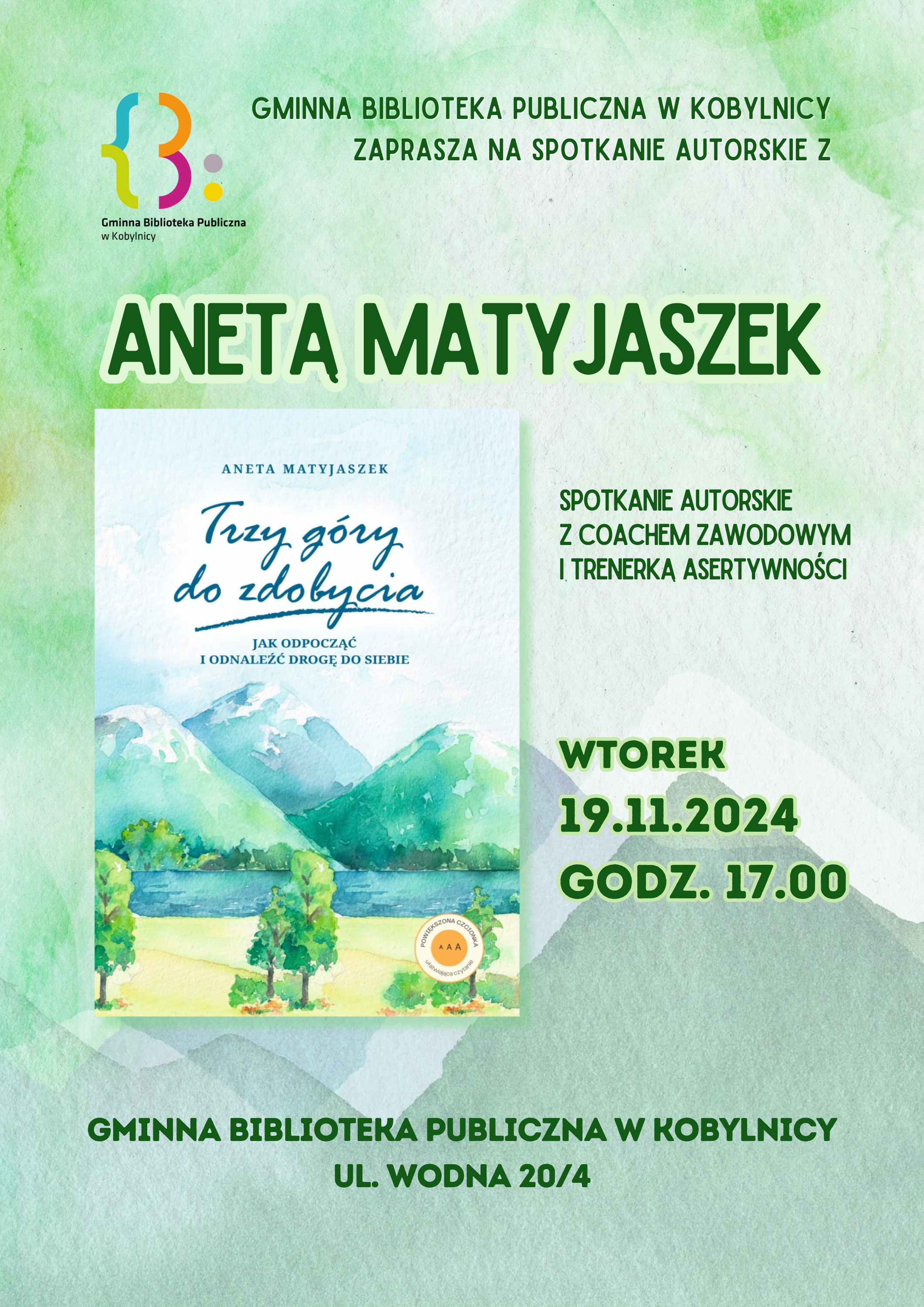 Spotkanie z Anetą Matyjaszek - coachem od zmiany zawodowej i trenerką asertywności - odbędzie się wtorek 19 listopada o godz. 17.00 w Kawiarence Literackiej GBP w Kobylnicy.